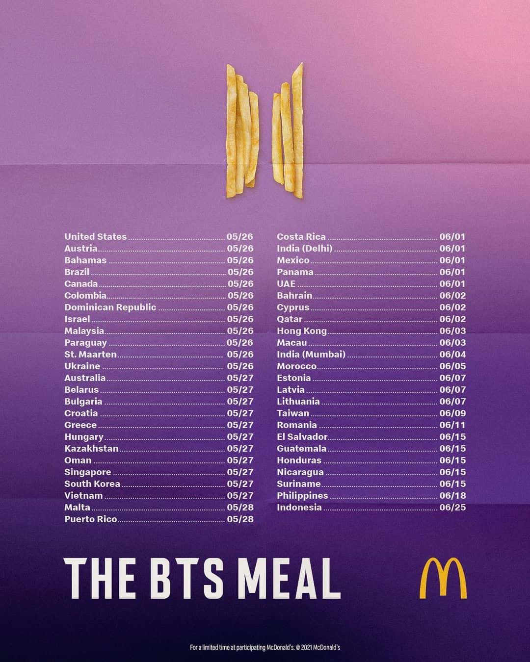 BTS Meal will be available in the US from May 26 and in BTS' home country South Korea, the meal will go on sale on May 27. Among other countries, BTS Meal will be available in Canada, Brazil, Austria, Bahamas and Colombia on the same day as the US, and in countries such as India (Mumbai), Australia, Singapore and Greece, the meal will be available from May 27 to June. Check the list of all the countries that the meal will be available below.