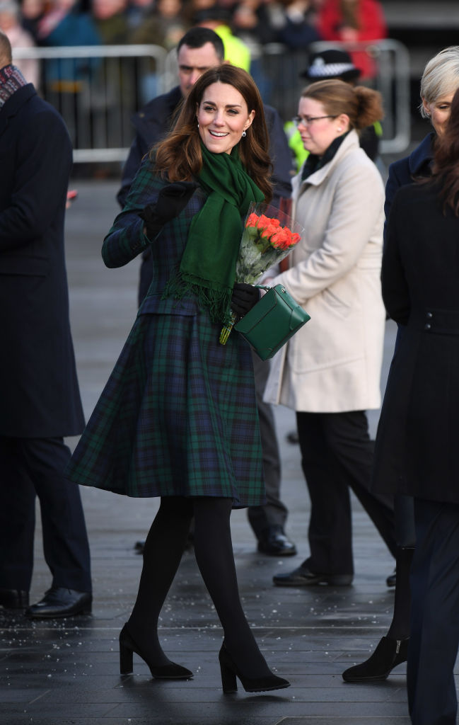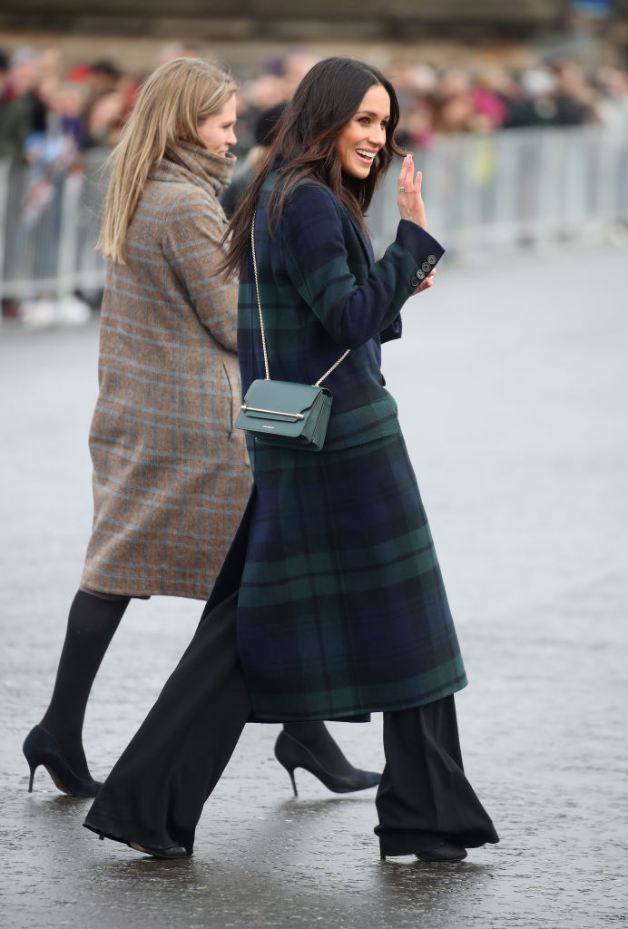 However, Kate's sister-in-law Meghan Markle also wore a similarly patterned coat when she visited Edinburgh, Scotland with husband Prince Harry in February 2018. 37-year-old Meghan wore a long green and blue tartan coat from British icon Burberry and paired it with a black turtleneck, black pants, and a green crossbody bag from Scotland-based handbag designer Strathberry.