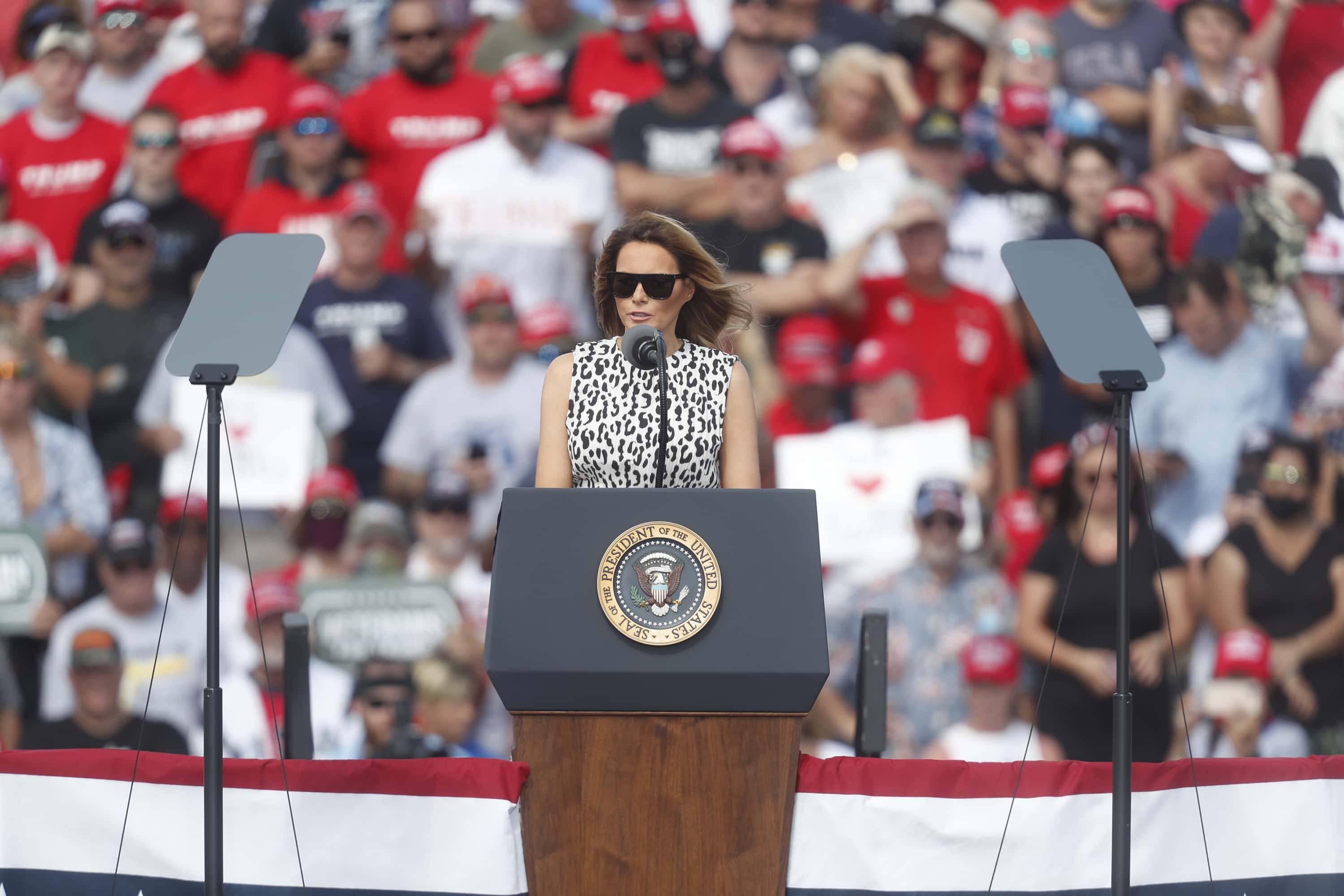Just days ahead of the 2020 presidential elections on November 3, Melania Trump was seen wearing a black and white ensemble that made her stand out from the crowd for a campaign event in Tampa, Florida. She opted for a statement outfit choice that one could not go wrong with, a cheetah print sleeveless midi dress cinched together with a pleated leather belt. As for footwear, the former model chose to go for a set of black So Kate pumps from Christian Louboutin.