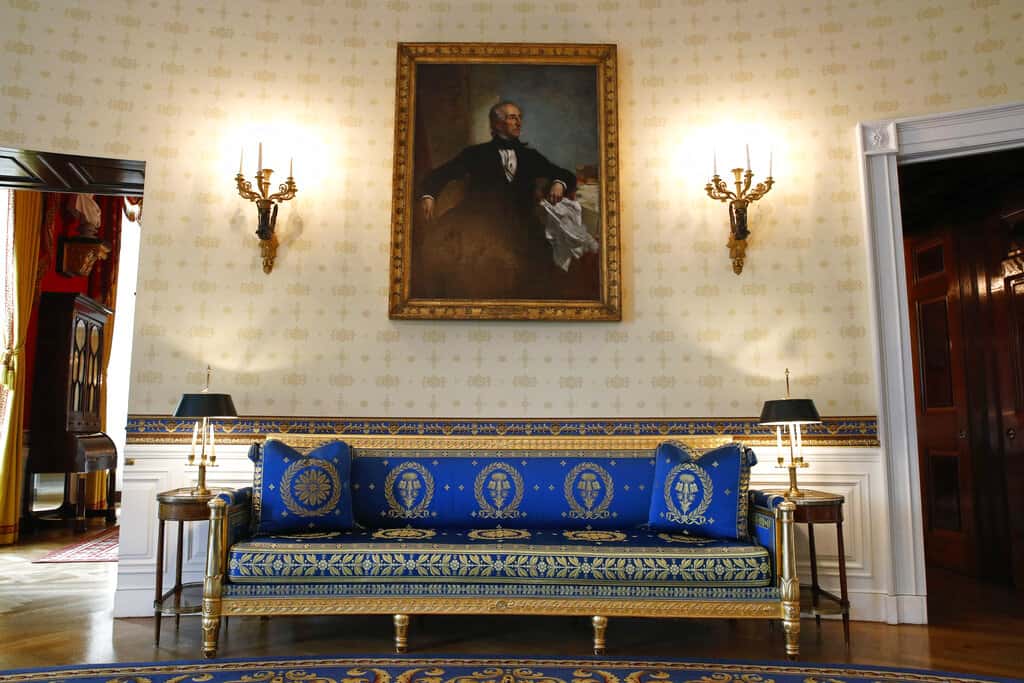 The Green Room in the White House was spruced up by switching the existing draperies from the backside to the front and replacing their fringes, which saved the cost of buying new ones and replacing the curtains entirely, McLaurin said. In the Blue Room, Melania restored several pieces from a historic 53-piece furniture set known as the Bellangé suite.