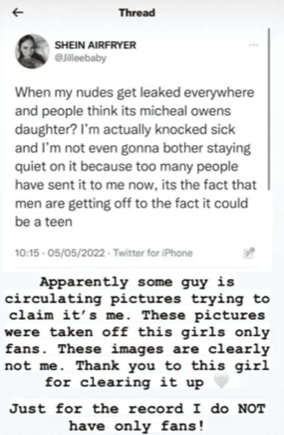 Irish model Jill verified to MailOnline that the images are hers, and she is angry that her photos were illegally leaked from OnlyFans. “When my nudes get leaked everywhere and people think it's Michael Owen's daughter? I'm actually knocked sick and I'm not even going to bother staying quiet on it because too many people have sent it to me now, it's the fact that men are getting off to the fact it could be a teen.” Moreover, Gemma has also cleared off the accusations.