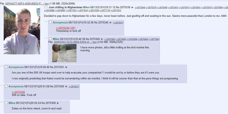Routledge, through posts to message board site 4chan and the live-streaming platform Twitch, claimed that he was quizzed by armed Taliban militants while on his way to Kabul International Airport. They allegedly asked him where he was from and he said Wales. He claimed they did not know where Wales was, and let him go. Routledge then said that he later came across another armed convoy and took a selfie on one of their gun emplacements.