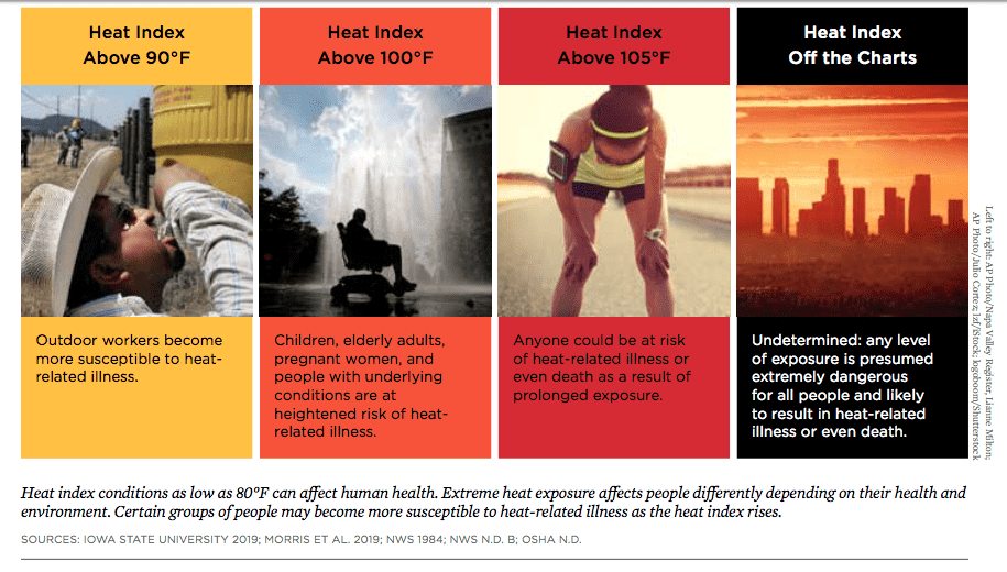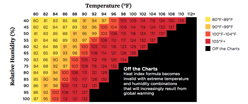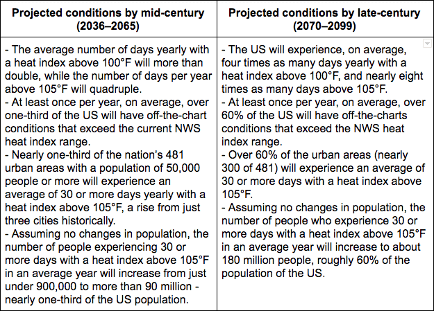 According to the researchers, the average number of days with a heat index above 100°F will more than double, while the number of days per year above 105°F will quadruple, by mid-century.