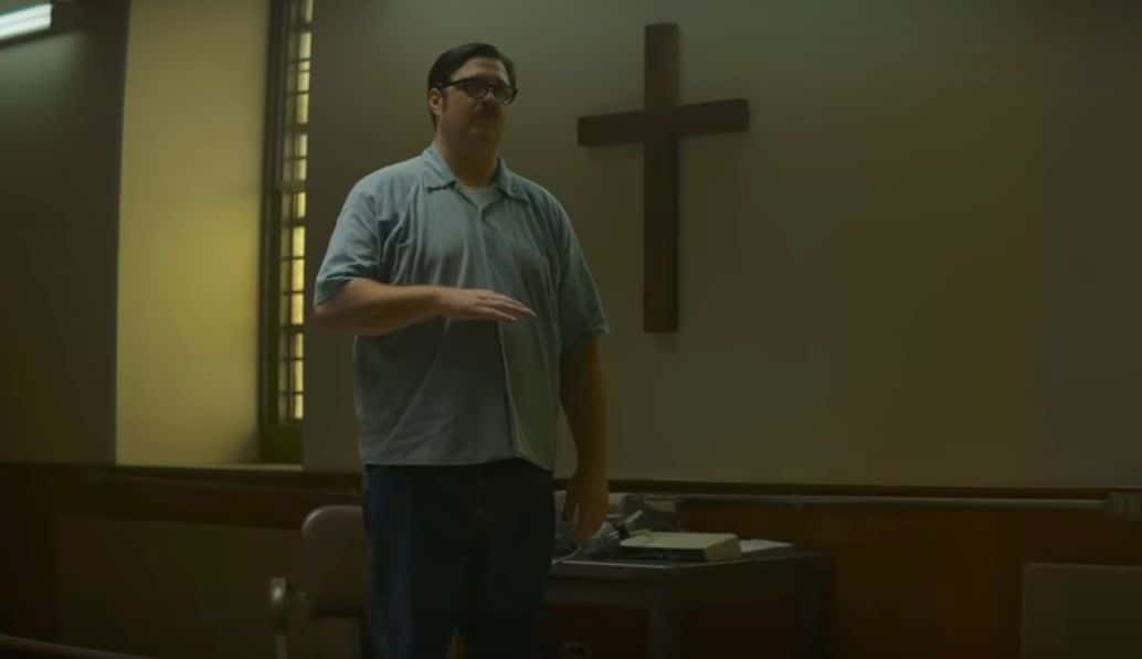 As Holden and Bill get back to interviewing serial killer Edmund Kemper (Cameron Britton) to gather more clues for the serial killings, he advises the two: “One more thing, Manson is small, like, really small — try not to stare." Soon after, Manson's figure appears in a shadow from the prison.