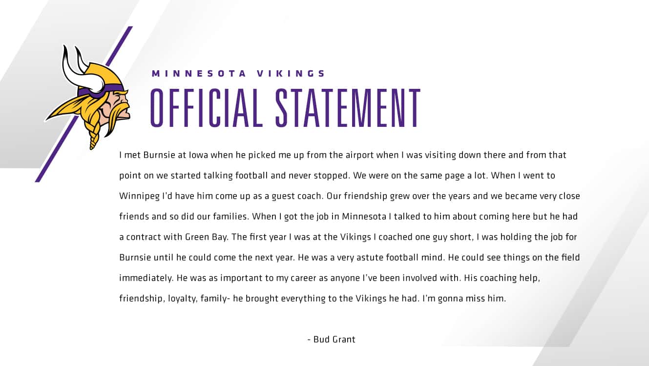 Hall of Fame Head Coach and fellow Vikings Ring of Honor member Bud Grant enjoyed a deep relationship with Burns that extended before and after their time together on the Vikings sidelines. Following Burns's death Grant issued the following statement: "I met 'Burnsie' at Iowa when he picked me up from the airport when I was visiting down there, and from that point on, we started talking football and never stopped. We were on the same page a lot. When I went to Winnipeg, I'd have him come up as a guest coach. Our friendship grew over the years, and we became very close friends and so did our families. When I got the job in Minnesota, I talked to him about coming here, but he had a contract with Green Bay. The first year I was at the Vikings, I coached one guy short. I was holding the job for 'Burnsie' until he could come the next year. He was a very astute football mind. He could see things on the field immediately. He was as important to my career as anyone I've been involved with. His coaching help, friendship, loyalty, family — he brought everything to the Vikings he had. I'm gonna miss him."