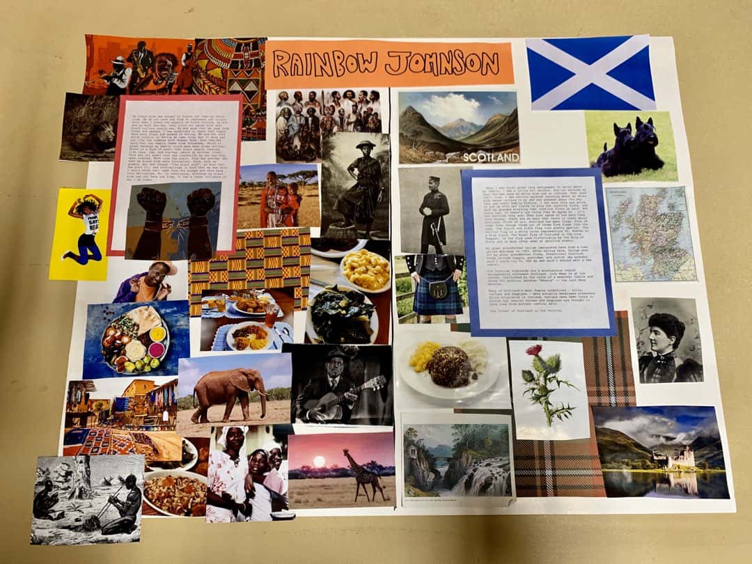 Bow's dad and grandfather are able to quickly tell her about her great-grandfather who came to America (legally, according to granddad) from Aberdeen in Scotland and later sent for her great-grandmother. Knowing this, Bow is able to soon fill up the half she's reserved for her dad's side of the family, complete with traditional outfits, "bland" Scottish food and the Scottish flag.
