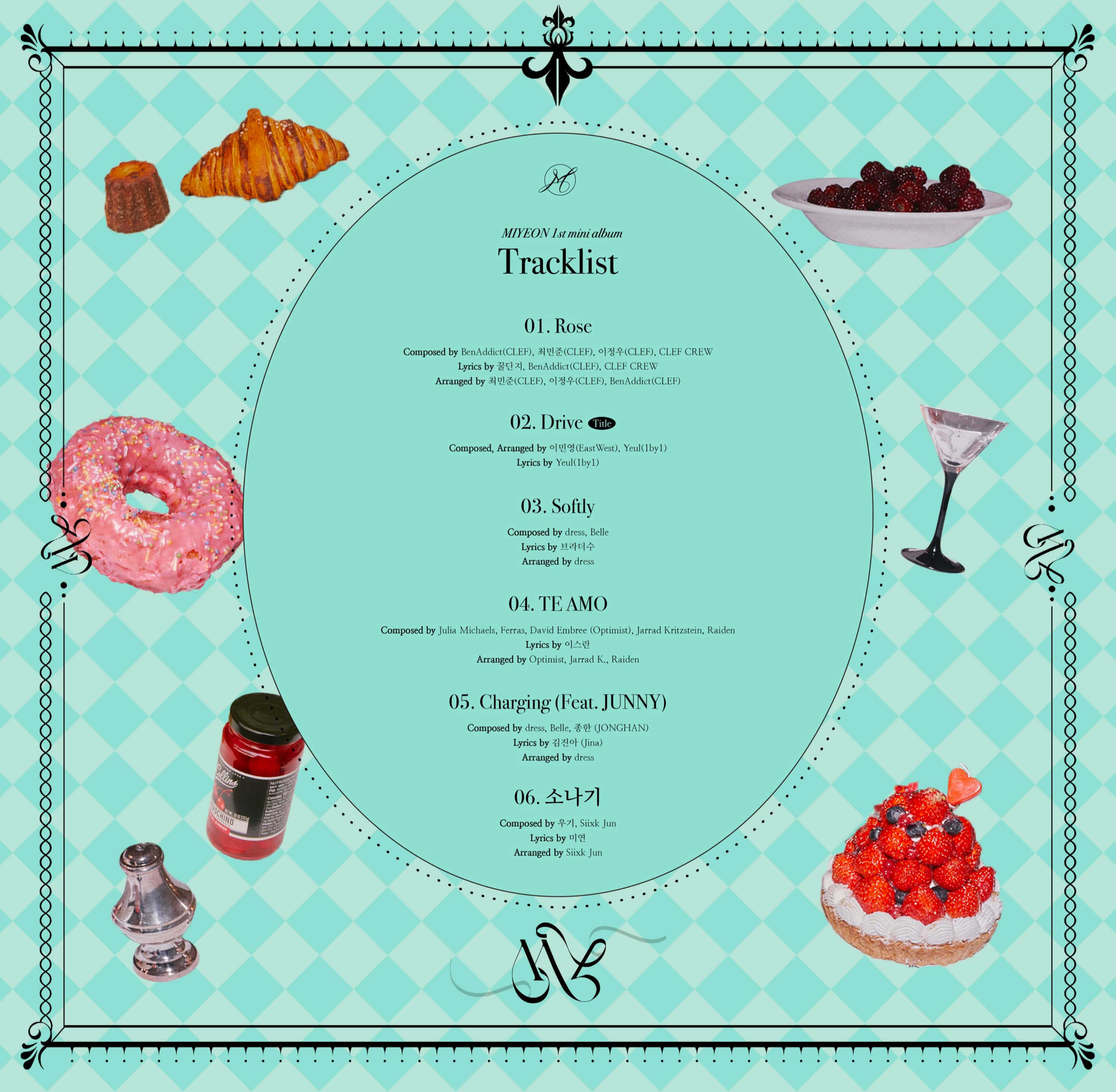 The tracklist for Miyeon's solo debut mini-album is decorated with six singles as well as interesting food items that tell the tale of the sweetness of the (G)I-DLE member. In the released tracklist, the fresh mint color and emotional props such as donuts and wine glasses harmonize to radiate the mood of spring. It is expected that with her solo debut, Miyeon will show her ability as a vocalist with five other tracks aside from the lead single 'Drive'.