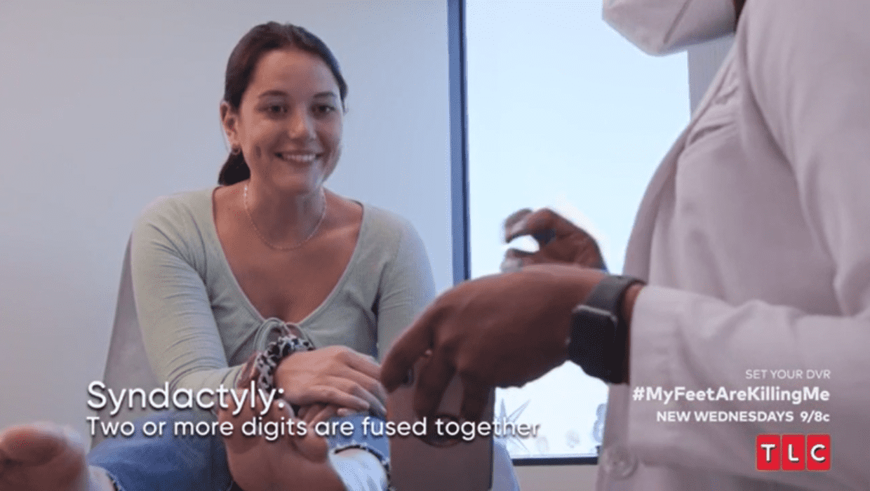 Dr Ebonie understands Kali's insecurity, which is driving her depression and anxiety. Kali tells the doctor that she was born with a webbed toe on her left foot, which she had to deal with while growing up, becoming increasingly nervous about it over time. She says that, while she does not suffer from chronic pain, the chafing against the shoes causes her distress. Kali had her x-rays taken before meeting Dr Ebonie. Her pinky had two bones, according to the x-ray. Her exterior bone was ordinary anatomy, and the other bone she possessed was polydactyly (extra finger or toe). The extra toe is again webbed to the fourth toe, which is known as syndactyly (two or more digits fused together). The terms, however, did stump viewers of the show as they tweeted, "What I'm hearing is she is a pterodactyl @DrEbonieV #myfeetarekillingme."