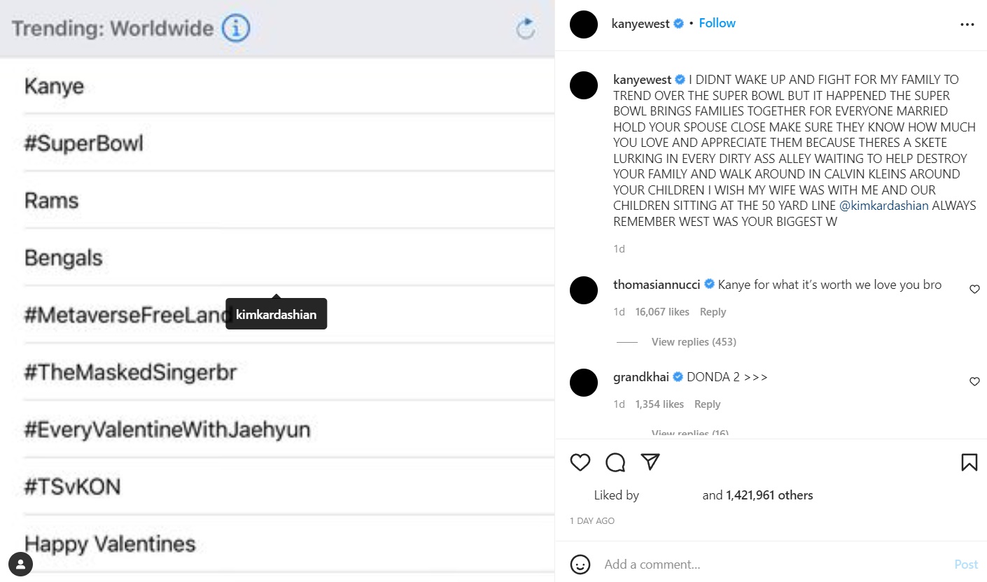 While getting ready for the Super Bowl, fans kept talking about Kanye’s feud on social media to the point that he ended up trending on top, higher than the Super Bowl on Twitter. Well, he noticed it and decided to talk about it on his Instagram. Kanye tried to take a bad situation and create a silver lining as he said, “I DIDNT WAKE UP AND FIGHT FOR MY FAMILY TO TREND OVER THE SUPER BOWL BUT IT HAPPENED THE SUPER BOWL BRINGS FAMILIES TOGETHER.”
