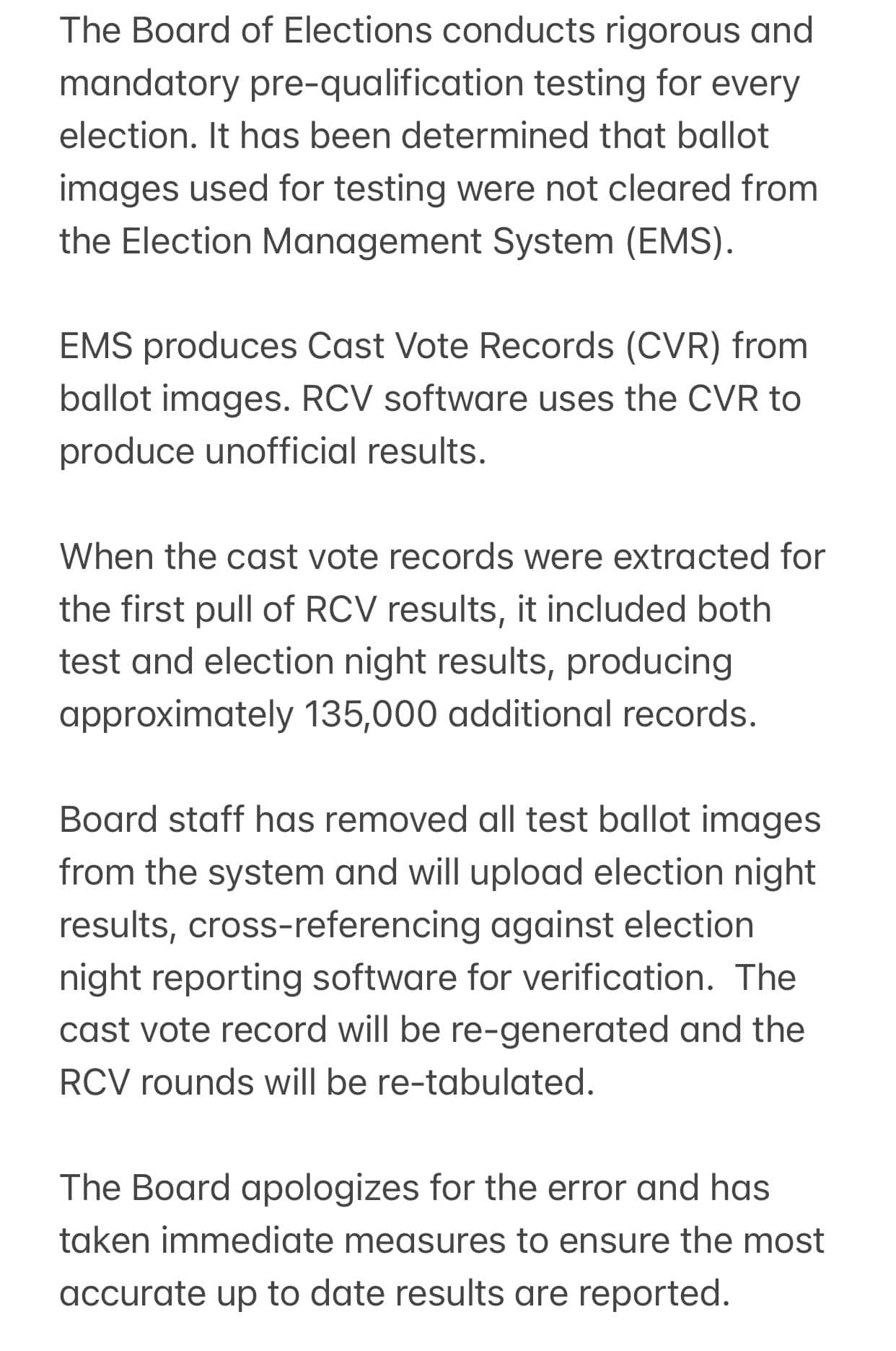 As a result, when the actual ballots began to be counted, the test ballots were also included in the count. That meant an additional 135,00 votes were never cast but counted. The BOE has now rectified the error, and removed all the test ballots from the system, and will upload the results after "cross-referencing against election night reporting software". Late on June 29, the BOE issued an apology via Twitter, after Adams highlighted it.