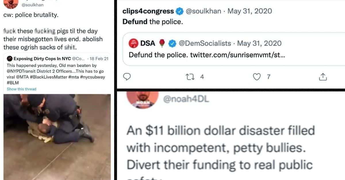 On February 28, 2021, the 37-year-old retweeted a video of an incident where cops are seen kneeling on top of an old man in the subway with the caption, "F—k these f—king pigs till the day their misbegotten lives end. Abolish these ogrish sacks of s—t. " Two months later, on the day Minneapolis cop Derek Chauvin was convicted for the murder of George Floyd, he wrote under the Twitter handle clips4congress @soulkhan, "Bless the jury, f–k the pigs, and keep fighting [to] abolish, not reform."