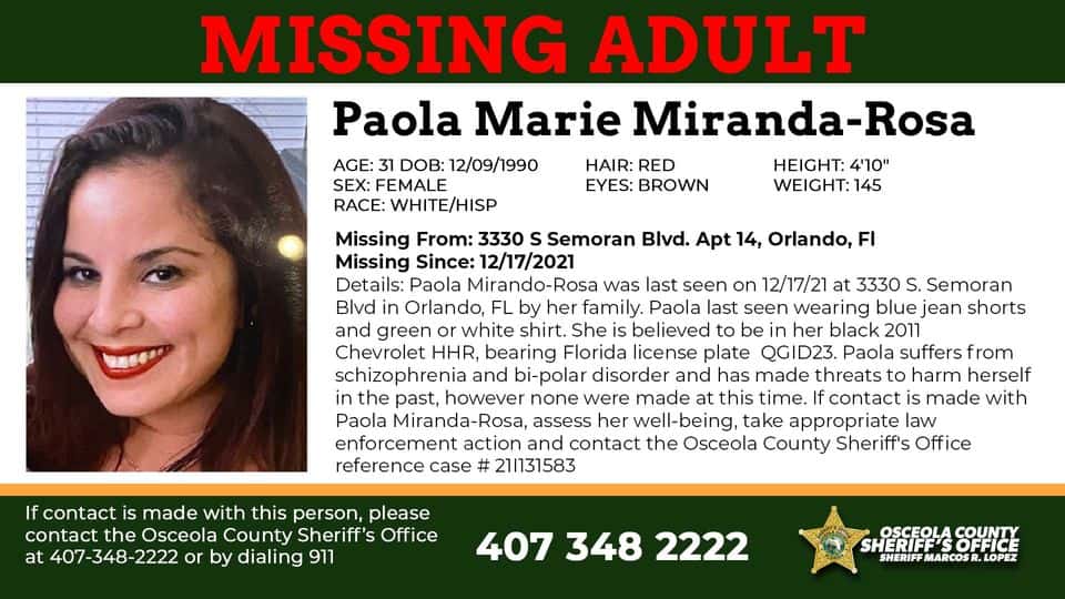 Rosa is feet 10 inches tall and weighs 145 pounds. She has red hair and brown eyes. If anyone has seen her, or knows anything about her whereabouts, you are encouraged to call the Osceola County Sheriff’s Office at 407-348-2222.