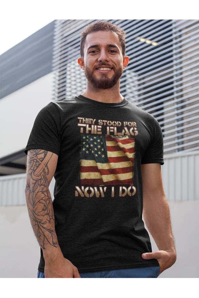 Other controversial images on PatrioticMe's products include the Thin blue line flag, which was flown by white supremacists at the "Unite the Right" rally in Charlottesville in 2017, and a t-shirt with the text, "They stood for the flag, now I do," in a direct reference to Black Lives Matter protestors, including Colin Kaepernick taking the knee to protest police brutality. The business's Facebook profile also features some of these products.