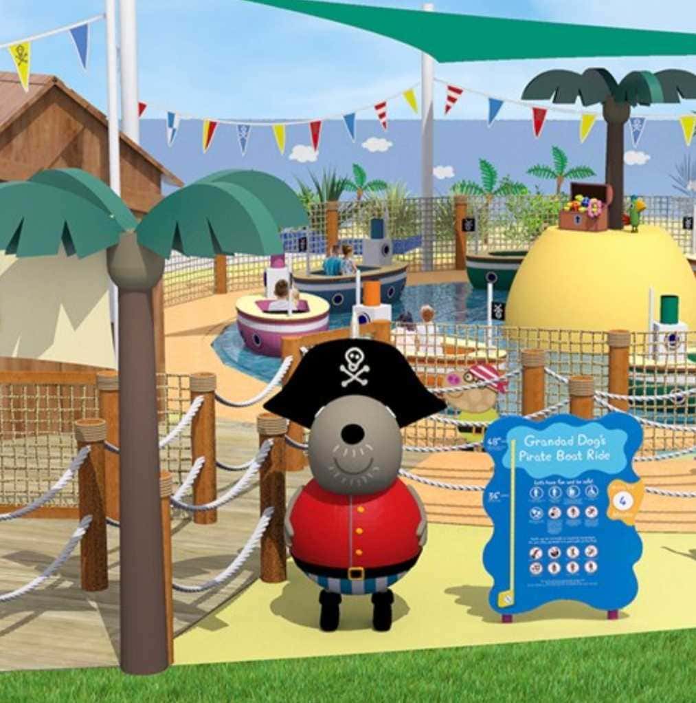 Visitors of the Peppa Pig Theme Park will be treated to the entire Peppa Pig experience, with lots of Florida theme park touches, including the Muddy Puddles Splash Pad, Granddad Dog’s Pirate Boat Ride, Grampy Rabbit’s Boat Adventure, Mister Bull’s High Striker, and Daddy Pig’s Roller Coaster.