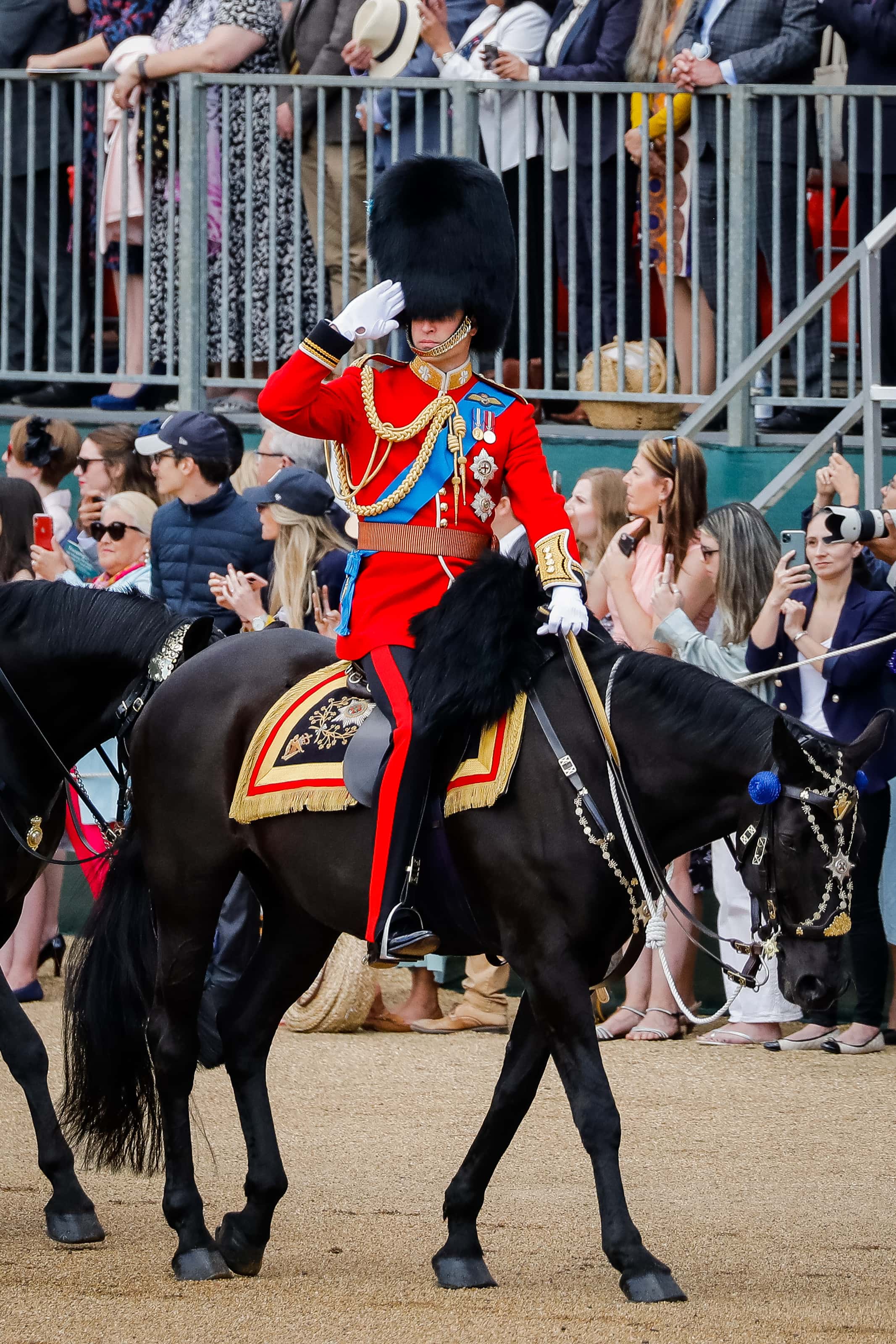 For the rehearsal, William wore the red and blue military uniform which was adorned with medals. This look was completed with the traditional bearskin hat. Horses of the Household Cavalry that are part of such parades undergo special training to become accustomed to noise and traffic. Moreover, they are trained to stand still for long periods with weight.