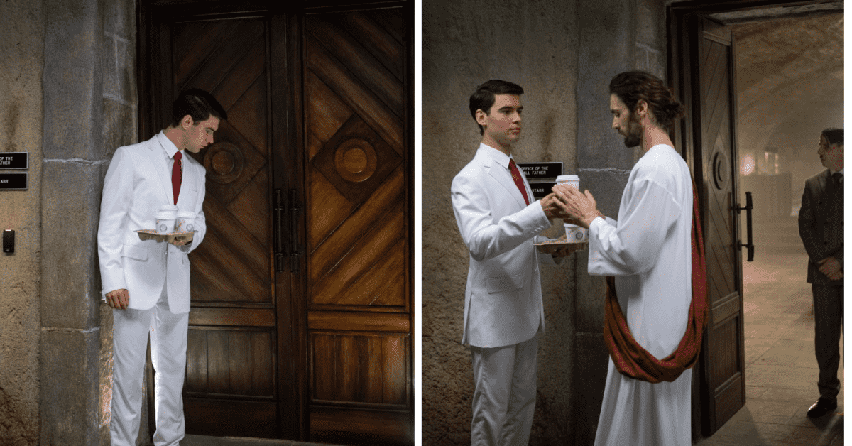 Jesse also seems to manage to piss off the angel troops who simultaneously pull their swords on him before Fiore reminds them there will be plenty of time for fighting once Hell arrives, referencing the imminent Apocalypse. Other stills show new Hoover (Aleks Mikic) eavesdropping near a door before handing Jesus and Hitler their coffee. Is he snooping for Herr Starr to make sure the Apocalypse goes off without a hitch even though Jesus and Hitler are in-charge of Heaven and Hell?