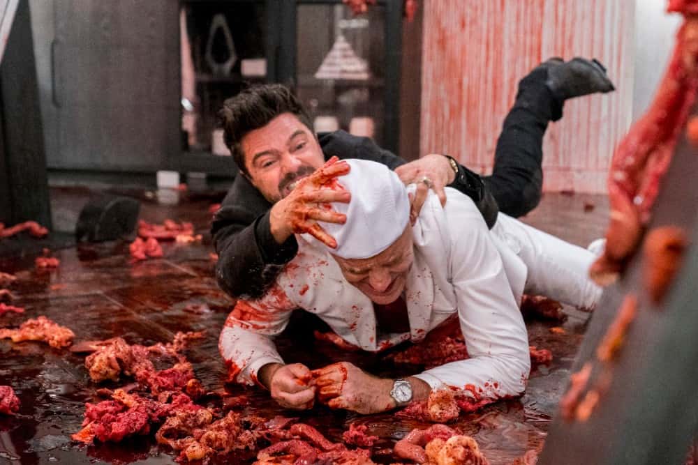 "There are hundreds of things I learned from Vince. Some of them I tried my best to incorporate and some were just not comparable — like intestines are not for strangling," said Catlin, referencing that bloody bit of mayhem towards the end of season 3. You know when Jesse Custer (Dominic Cooper) and Herr Starr (Pip Torrens) fought among the entrails of the All-Father, and Jesse tried to strangle Starr with said entrails?