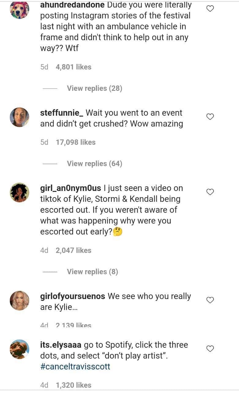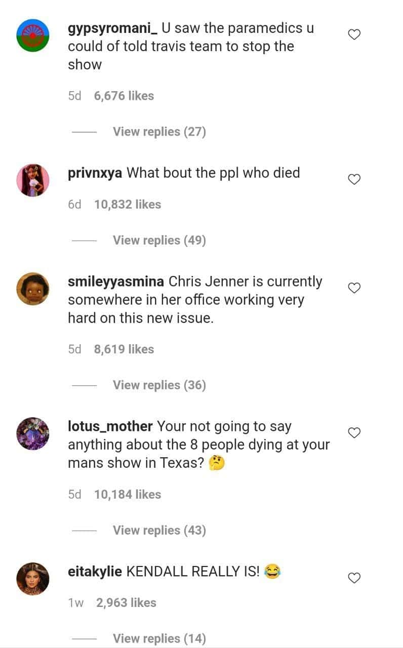 One of her fans commented, "U saw the paramedics u could have told Travis team to stop the show." Another Instagram user hopped on the bandwagon and said, "You're not going to say anything about the 8 people dying at your man's show in Texas?"