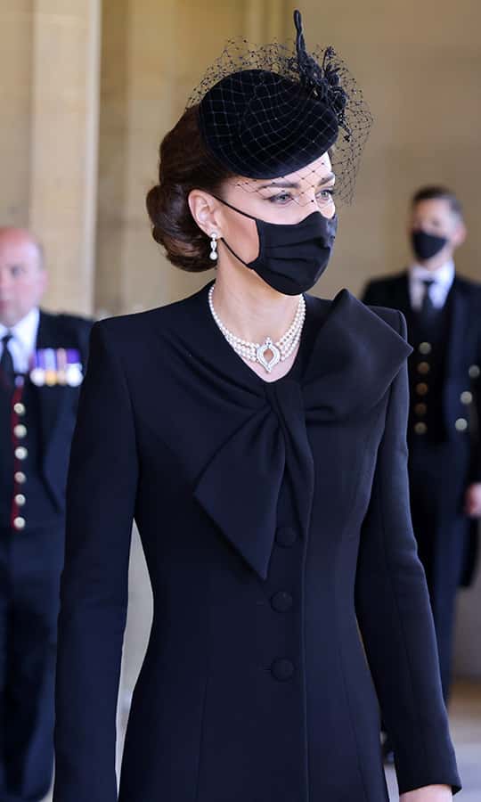 Kate Middleton paid a touching tribute in pearls to Princess Diana and The Queen by wearing Her Majesty's pearl choker to Prince Philip's funeral. According to reports, the Queen had the necklace made years ago with pearls that the Japanese government had sent her as a present. The queen has worn the pearl necklace on many occasions over the years, including a royal engagement in Bangladesh in 1983.