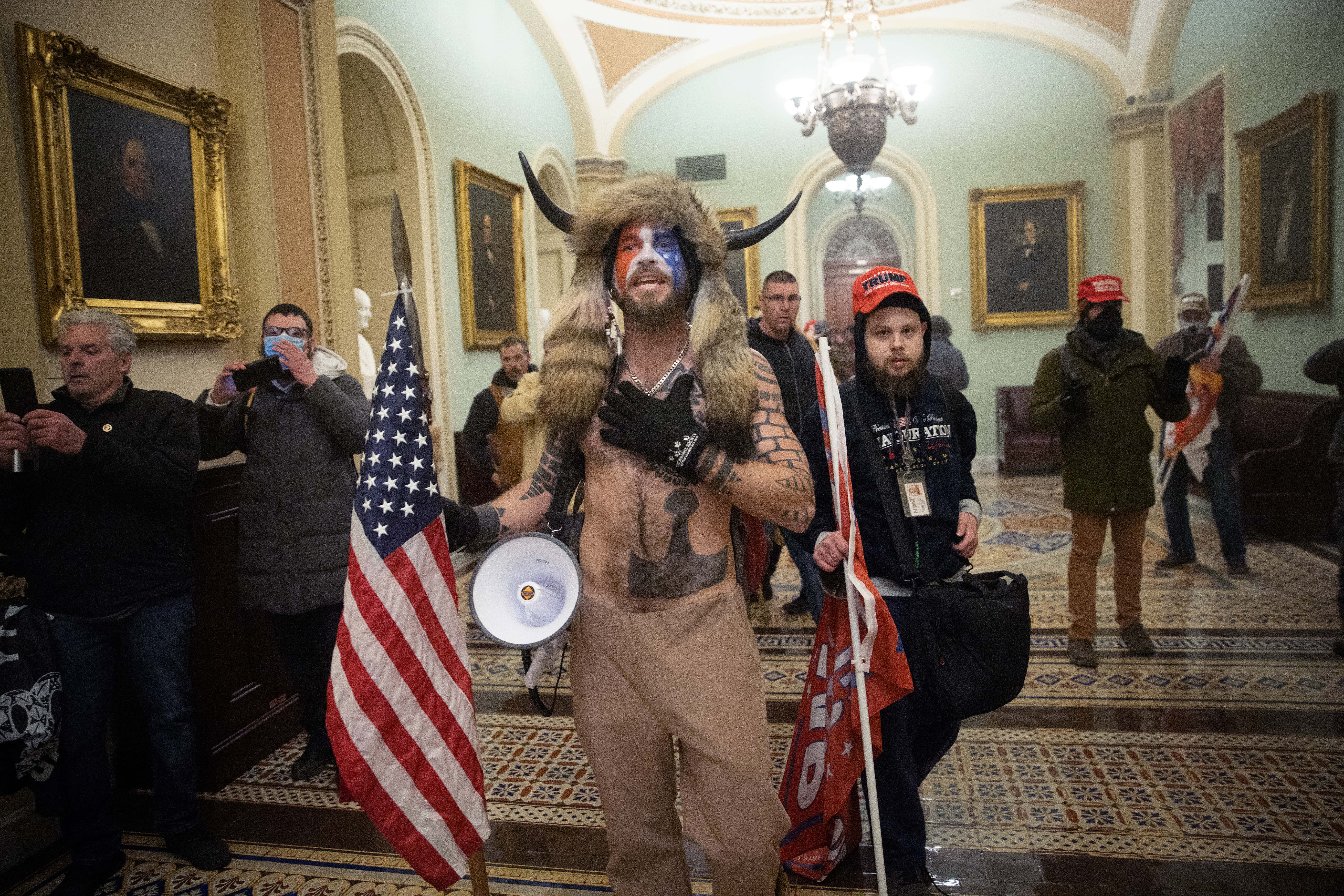 Jake Angeli, 32, sporting horns and body paint, yells his thanks to President @realDonaldTrump and Q.