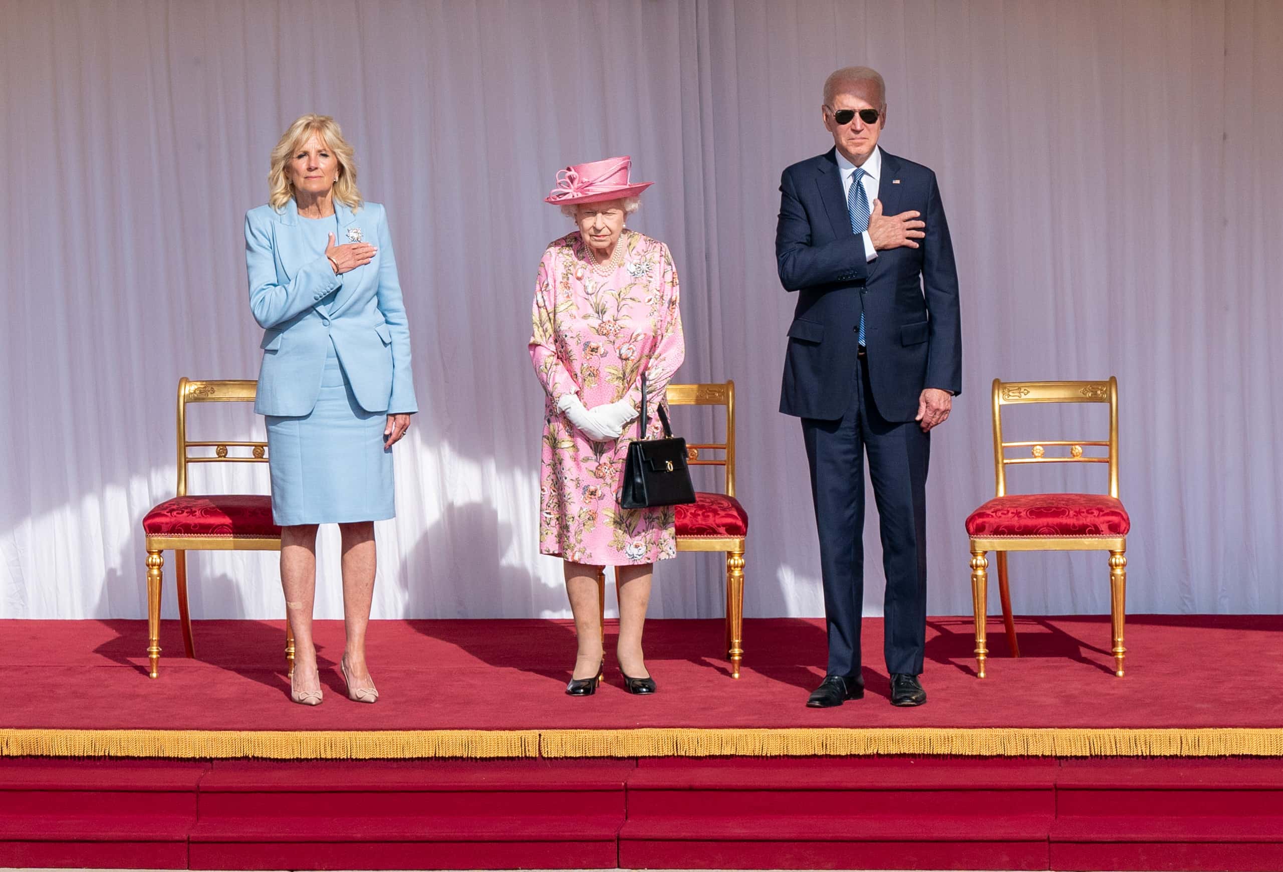 Queen outshines Jill Biden in pink floral dress, hat as she hosts Bidens for tea