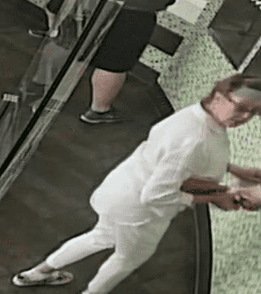 The suspect was also wearing patterned tennis shoes and glasses, cops said.