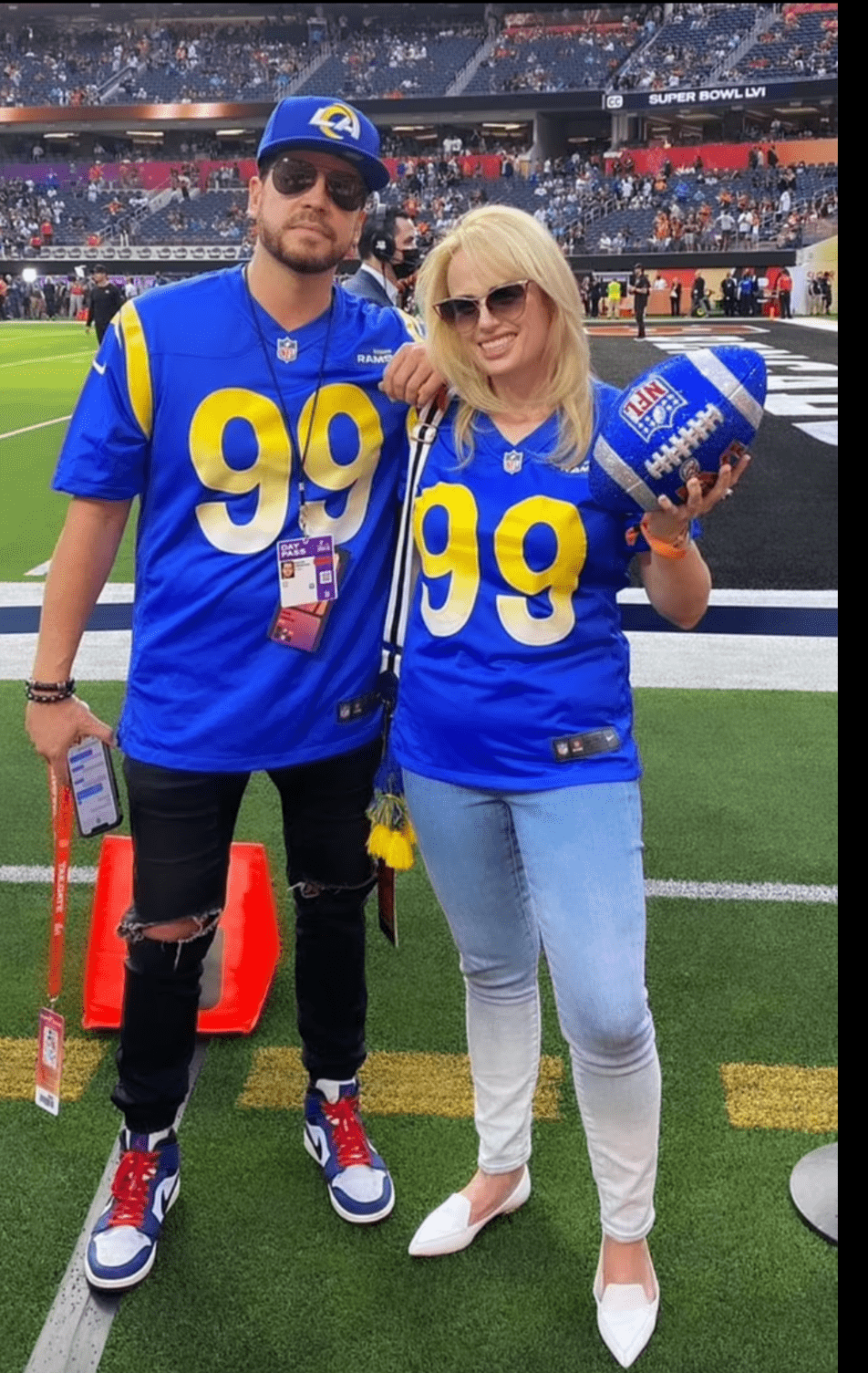 Aussie star Rebel Wilson has shed 35 kgs over the past 18 months and her stunning new figure has made fans go ga-ga at this year's Super Bowl LVI in California. The actress wore a blue and yellow Los Angeles Rams jersey and skinny jeans to a match, leaving her long blonde locks free and wearing a neutral palette of makeup to the game.