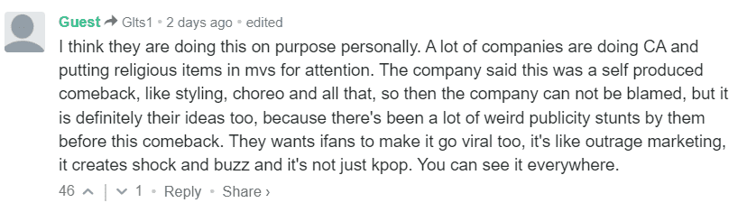 One explained, “I think they are doing this on purpose personally. A lot of companies are doing CA and putting religious items in mvs for attention. The company said this was a self produced comeback, like styling, choreo and all that, so then the company can not be blamed, but it is definitely their ideas too, because there's been a lot of weird publicity stunts by them before this comeback. They wants fans to make it go viral too, it's like outrage marketing, it creates shock and buzz and it's not just kpop. You can see it everywhere.” Another posted, “Literally they googled africa tribe on google and used first result that came up. im tired....”