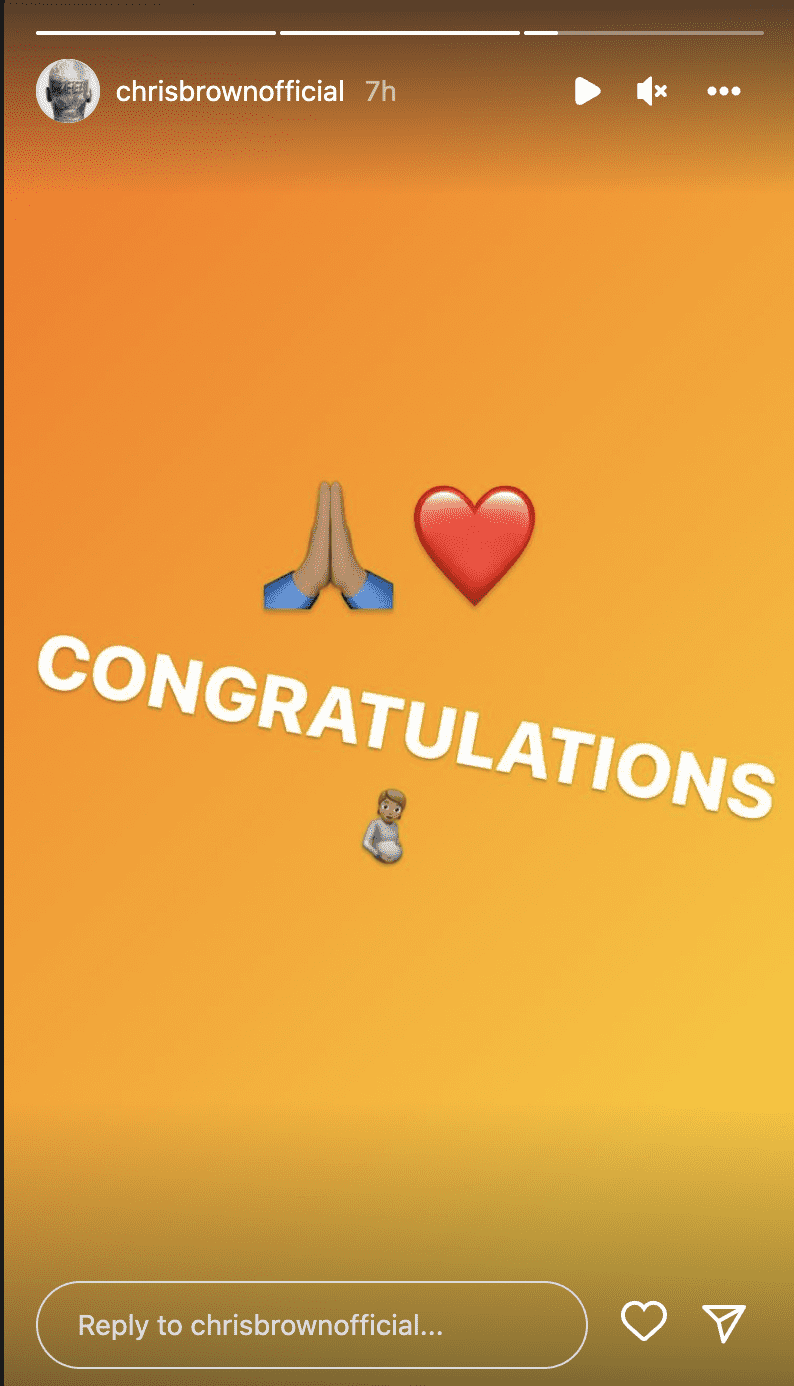 But Shortly after the news broke out, Breezy quickly took to his Instagram and shared a story saying congratulations with prayer hands, a heart, and a pregnant person emoji. Of course, we know who it is meant for.