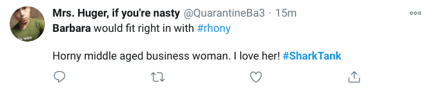Fans love that she is brutally frank on the show. "Barbara would fit right in with #rhony Horny middle-aged businesswoman. I love her! #SharkTank," one posted, pointing out that she'd be the perfect cast member on the reality TV show 'Real Housewives of New York' aka RHONY. Minutes later, the Twitter user deleted the tweet. In fact, Barbara herself tweeted, "Being the only woman in the room can be tough. When I built The Corcoran Group, the New York 'old boy network' tried to lock me out of their real estate fortunes. Then I became their largest competitor. #SharkTank."
