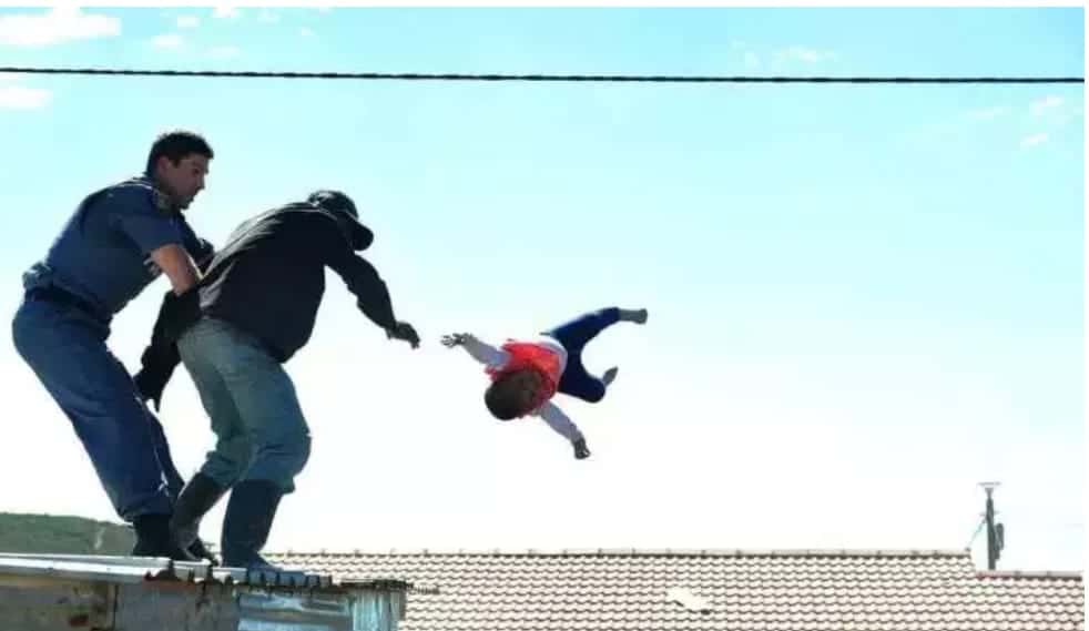 The officers had almost contained the situation when this man climbed onto the roof of his shack and threatened to throw his daughter to death if the team did not leave his home alone.