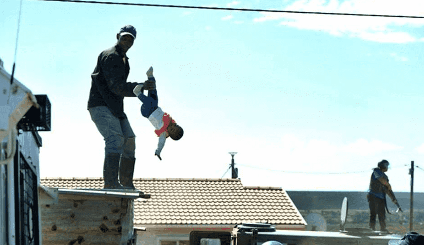 The unidentified individual was protesting against the destruction of dozens of shacks at a township in Kwadwesi near Port Elizabeth in South Africa when he took the baby and climbed on top of their home defying authorities.
