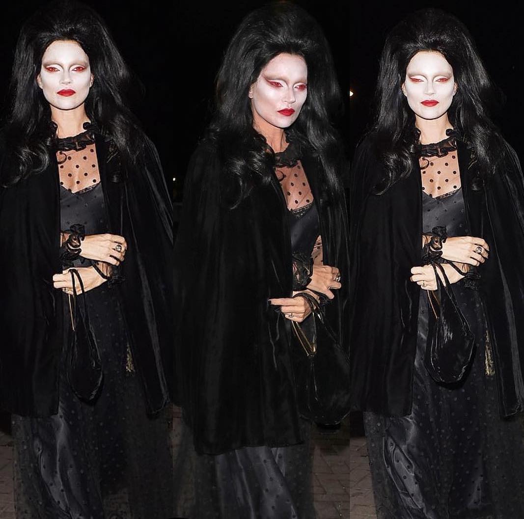 Kate Moss transformed into a vampire for Rita Ora's bash in London, wearing an all-black outfit and long black wig. Her face was painted white, with red lips and eyes. (Instagram)