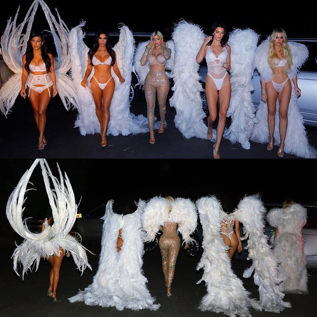 In one of the many looks they adopted for Halloween, the KarJenners — Kourtney, Kim, Khloe, Kylie and Kendall — borrowed former runway looks from lingerie giant Victoria's Secret for coordinated costumes... and the angels looked dreamy and gorgeous as they strutted through Los Angeles (Instagram)