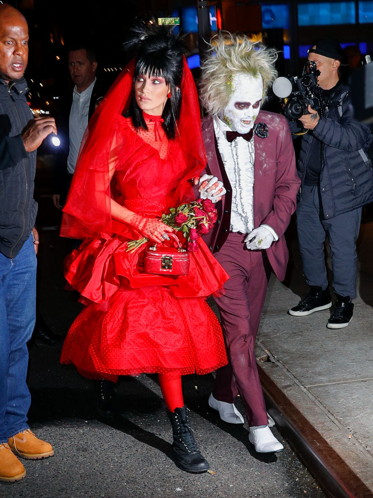 Bella Hadid and The Weeknd dressed as Beetlejuice and Lydia from the 1988 classic 'Beetlejuice' for Heidi Klum's annual Halloween party in New York City. (Photo by Jackson Lee/GC Images)