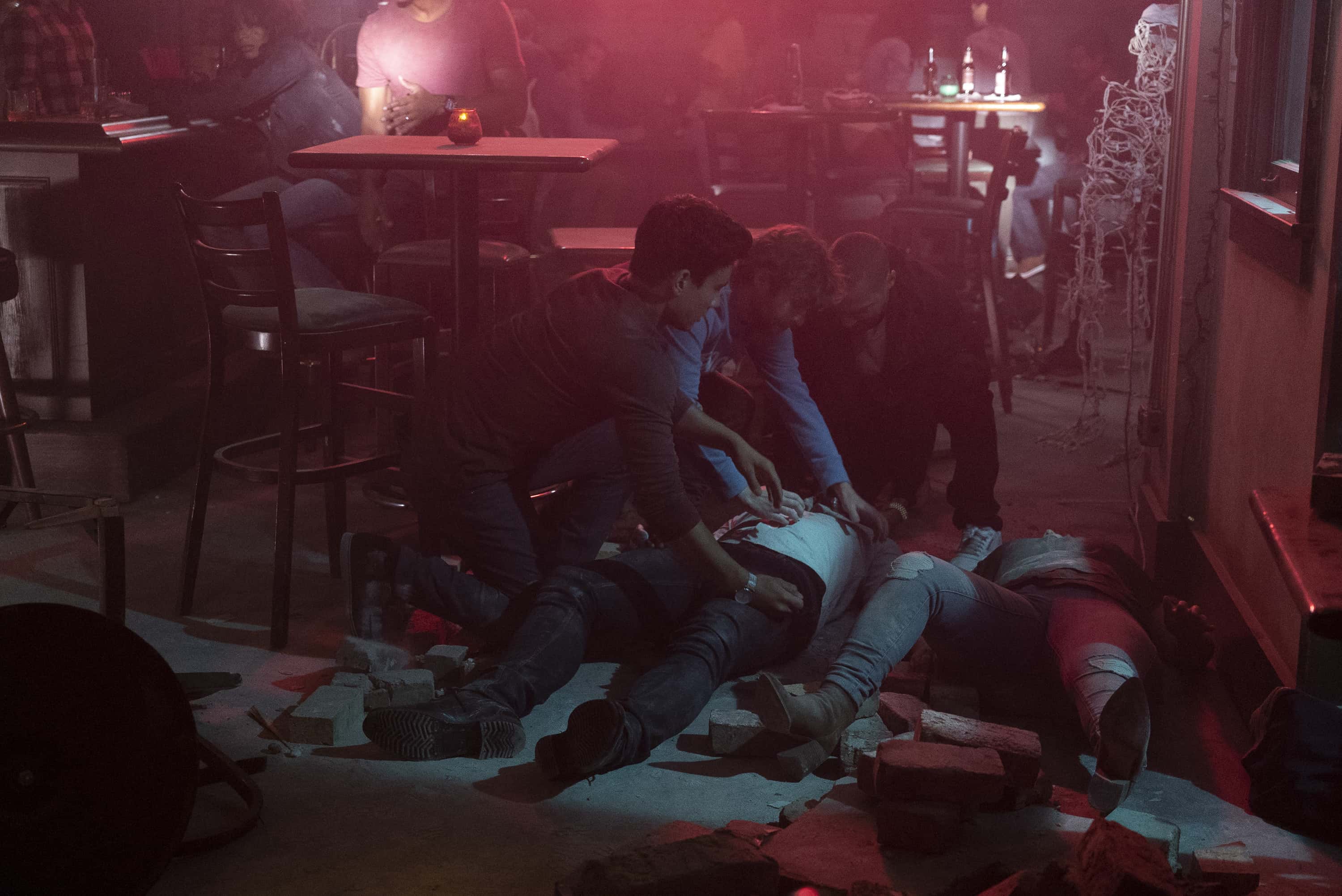 In this two-hour special, the storylines are intertwined. Inside the bar, Jackson, Ben and Levi are safe but several interns and other people are terribly injured. With broken limbs, spilled blood and cries for help all around, Levi Schmitt (Jake Borelli) is in a state of shock.