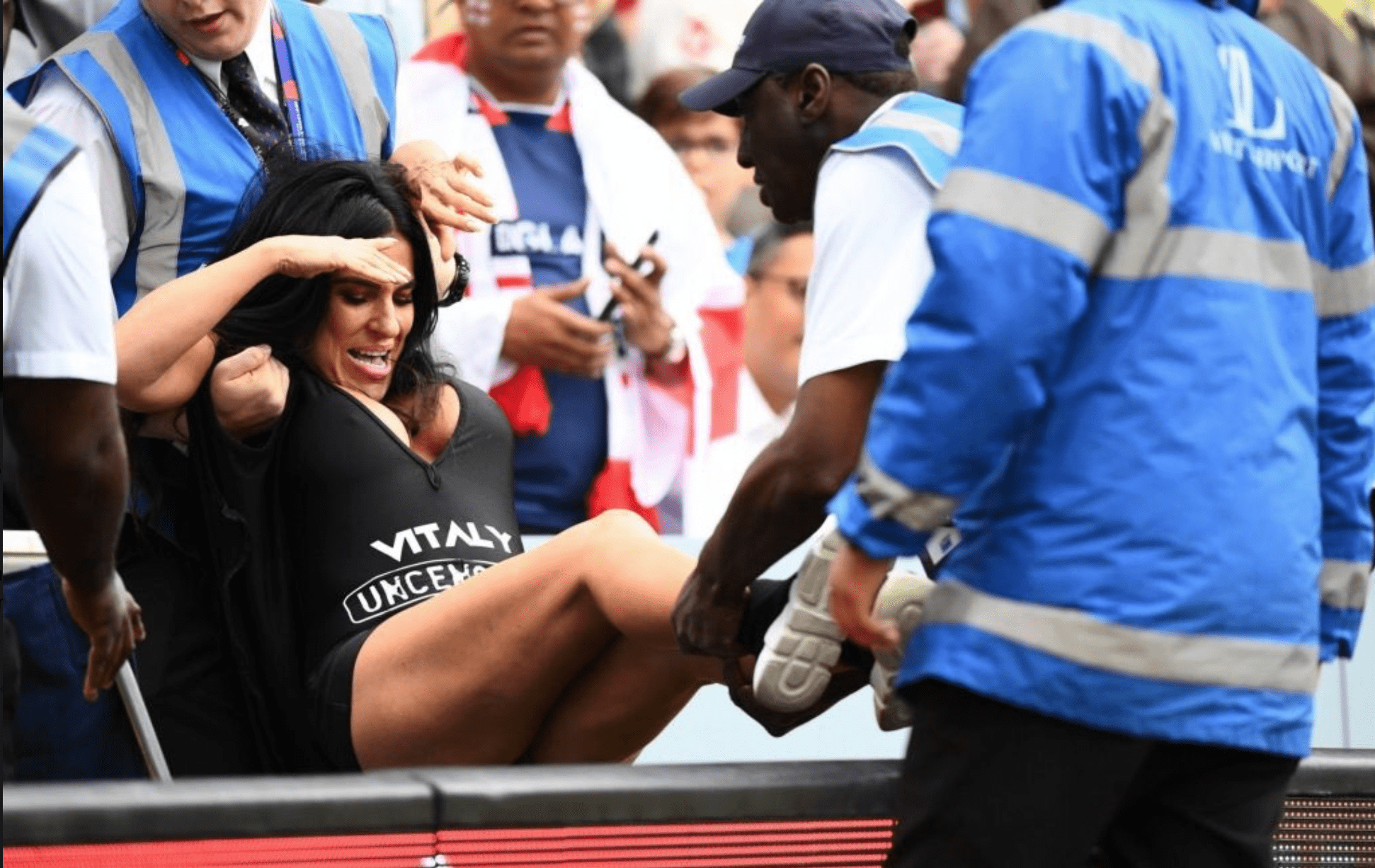 The woman wore a black swimsuit advertising the same X-rated website, Vitaly Uncensored, that another streaker displayed across her outfit during the UEFA Champions League final between Liverpool and Tottenham Hotspur. Unlike the football match where it took security a while to nab the pitch invader, this time the woman was unsuccessful.
