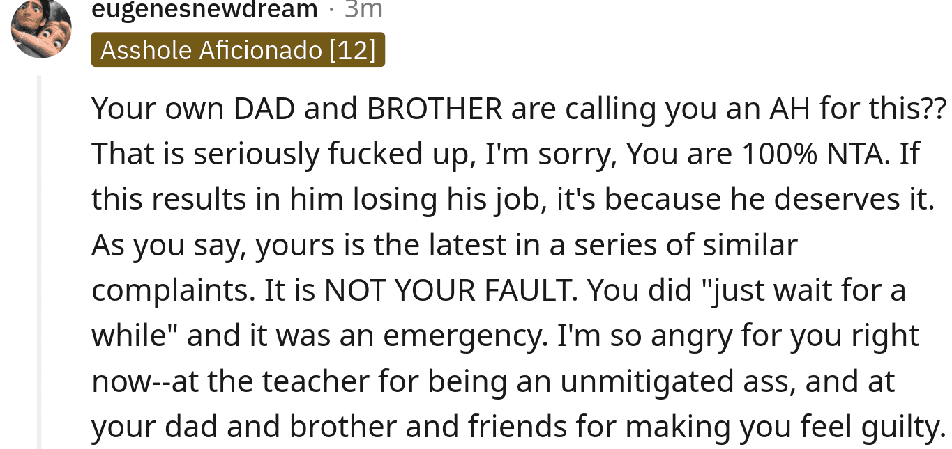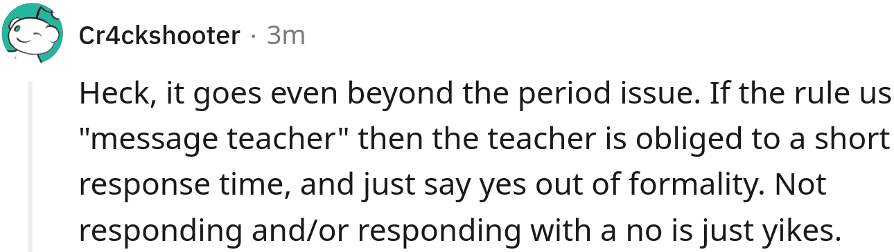 The people of Reddit were able to reassure the girl that she was not in the wrong. One person wrote: NTA. First of all, this is highly unprofessional. Second, there were more complaints about him, he brought this on himself. If a student needs to use the restroom, they have to go. Have a rule like one bathroom break per lesson and recommend students to use the restroom in between classes. But he couldn't be bothered to be professional, that will get him fired.