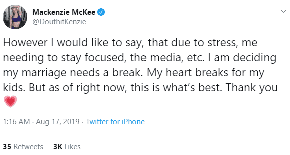 She tweeted, “I would like to say, that due to stress, me needing to stay focused, the media, etc. I am deciding my marriage needs a break,” she wrote.