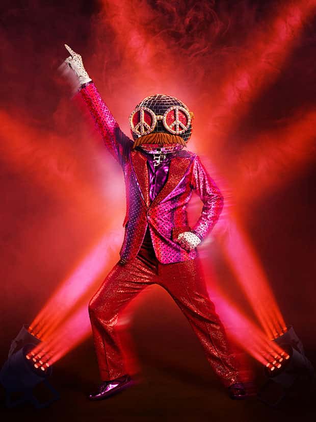 A disco dancer, whoa! The costume takes you back to the '80s disco era, doesn't it? With a slice of psychedelic fever, Disco Ball is clad in a red and pink suit for his performance with a peace sign on his glasses and a signature mustache.