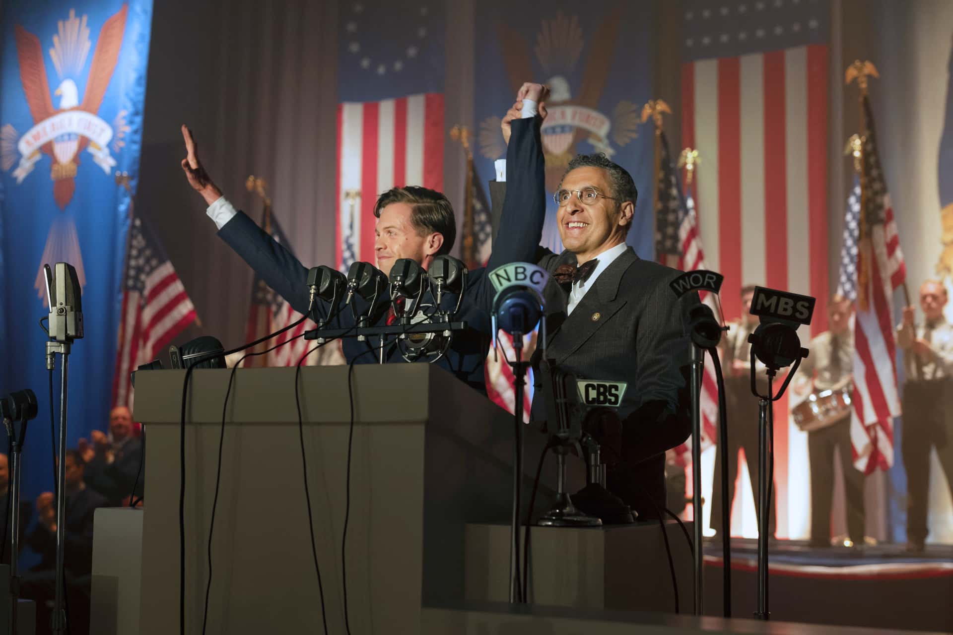 What really takes the cake is when Lindberg begins to face opposition from a radio newscaster who announces that he is going to oppose Lindberg in the next presidential election. Herman, despite opposition from Bess (Zoe Kazan), decides to attend this newscaster's first address to the public and sees how the country has turned against Jews. He sees men feigning to be Jews entering the gathering and attacking people calling them Nazis to make everything seems as if it were the Jews' fault for inciting violence. Herman himself is hurt and is bleeding and returns home with bloody bruises and Bess, who is also glad that he is fine still, draws a line. She tells him that if Herman continues to put up a fight, she will leave to Canada and take the kids with her as well.