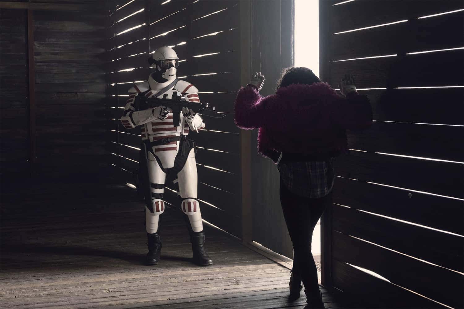 The quad was traveling to find Stephanie (Margot Bingham), Eugene's crush when they were captured by the men that look like storm troopers. The episode continues the storyline from there itself when the Alexandrians and Princess were told to surrender and drop their weapons. Each of them was then thrown into an individual boxcar, and when Princess is by herself, her mind keeps going back to how her scuffle with the knife led to Yumiko being hurt.