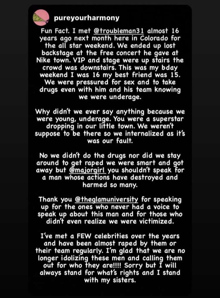 In a public Instagram post, Sabrina Peterson — whose handle is @theglamuniversity — said, “The sad part about being a woman & BEING A BLACK WOMAN IS THIS! The public PRAISES OUR PREDATORS! @troubleman31 you PUT A GUN TO MY HEAD IN FRONT OF CHILDREN & I NEVER CALLED THE POLICE ON YOU! But for years you have painted me as the VILLAIN!”