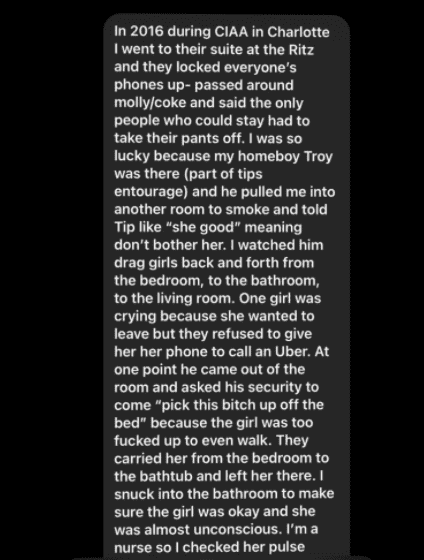 Detailing a disturbing incident during CIAA in Charlotte in 2016, one anonymous woman who Sabrina referred to as Victim #15 said she went to TI and Tiny’s hotel suite at the Ritz-Carlton. Once there, her phone was confiscated and she was asked to try molly and cocaine. Then they strictly told people to stay only if they removed their pants. “I watched him drag girls back and forth from the bedroom to the bathroom, to the living room,” she wrote. “One girl was crying because she wanted to leave but they refused to give her her phone to call an Uber.”