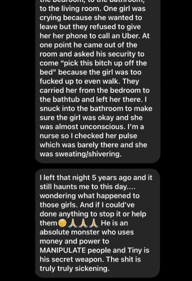According to the messages Sabrina shared, Tiny has been dubbed as the “ringleader” by many women, of which, one of them claims Tiny made her pop a Molly (an MDMA stimulant, similar effects like ecstasy) and engage in sexual acts. One went on to say he calls women “cattle”.