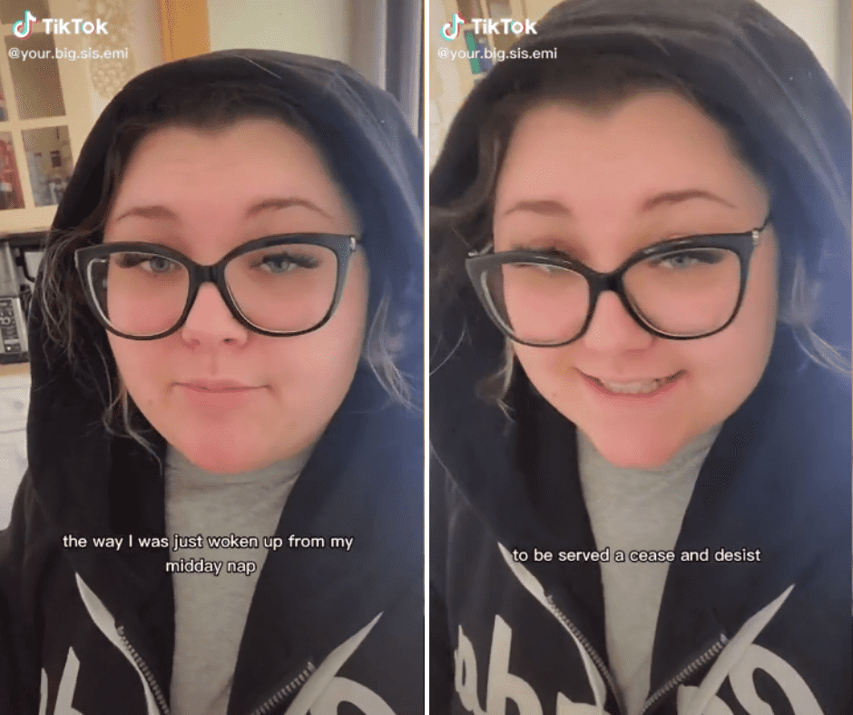 Emily, who goes by the username @your.big.sis.emi, posted a promo video of her new podcast which has now been deleted. Less than 12 hours after she posted the video, she was served with a cease and desist notice for slander. In a follow-up video, she said she was rudely woken up from her midday nap to the legal notice. She quickly consulted her lawyer and found out that it did not hold any legal grounds for slander since no one could tell whom she was talking about. "Also, is it really slander if it's true?" she added at the end of the video.