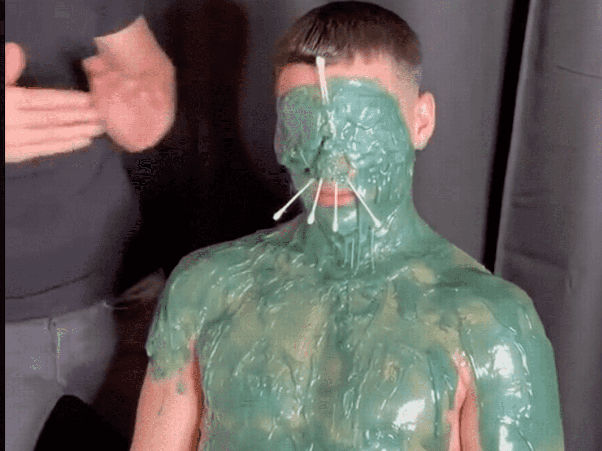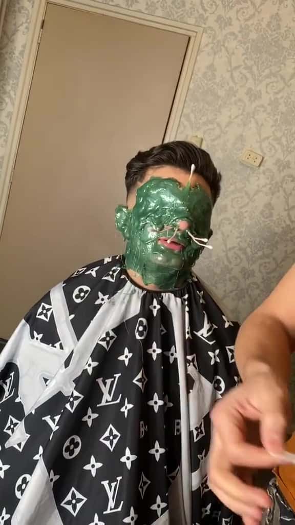 The video clip shows a barber pouring gooey green wax onto the customer's face, including their eyes, nose and ears. The customer has wax-dipped Q-Tips inserted into his nose, presumably to extract nasal hairs. The barber in these TikTok videos, Renaz Ismael, frequently posts similar videos of his clients getting "treatments" done and claims them to be beneficial.