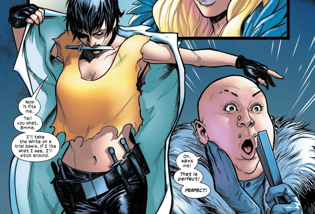 As White King of the new Hellfire Trading Company, Emma Frost is recruiting, and she sees no one more fit for the position of White Knight than Callisto. She has mutant fashion designer Jumbo Carnation design a white coat for Callisto, which Callisto eventually accepts...with some modifications. Whipping out her trademark knives in response to Frost's offer, it seems like Callisto is going for an attack. But instead, she merely cuts off the coat's sleeves to make something that's a little more her style and Jumbo Carnation approves.