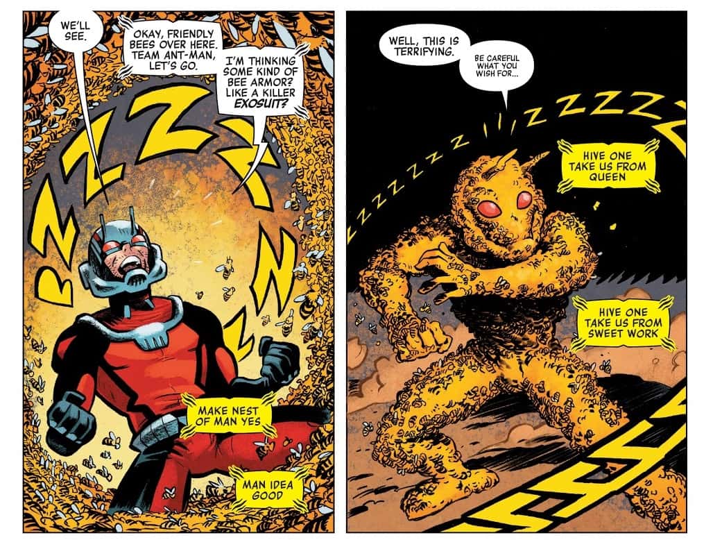 It turns out that with some tinkering, Ant-Man's helmet can help him talk to more than just ants. The entire insect kingdom is at his beck and call. More or less. If he's polite about it. In a new mini-series, Ant-Man investigates the disappearance of bees from their hives and comes across the supervillain, Swarm, who is a Nazi scientist, who is made out of bees and can also control bees. Yes, Marvel knows how ridiculous that is. Harnessing the power of bees himself, Ant-Man calls for some protection, giving him a layer of swarmed bees to keep him safe.