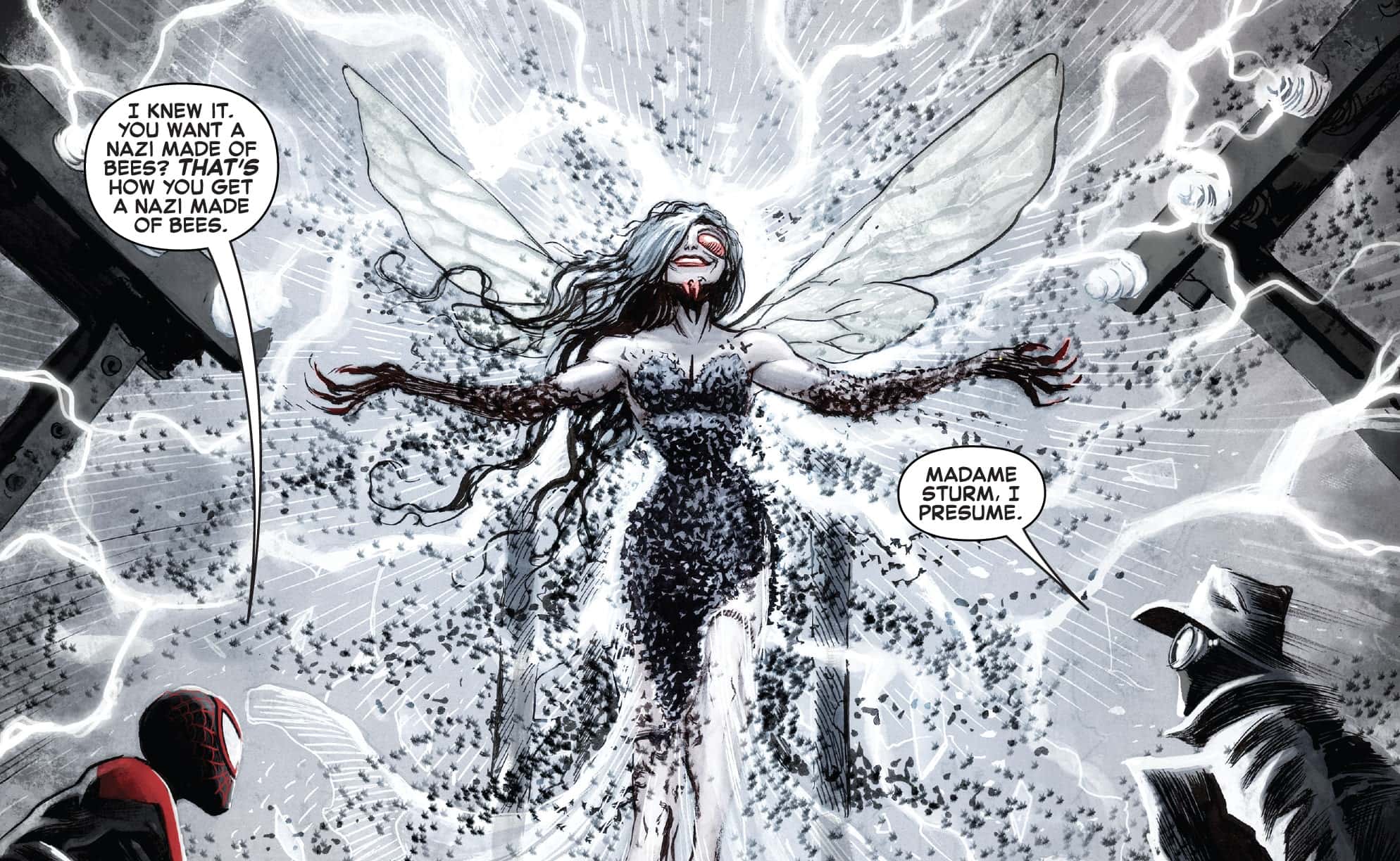 Yes, it's another costume made entirely out of bees, in the same week! 'Spider-Verse' #5 sees Miles Morales pay a visit to Spider-Man Noir on his Earth. The spider idol that gave Spider-Man Noir his powers has been stolen by Nazi scientist Madame Sturm, who unlocks its powers to merge with the true object of her research: Bees. She rises gloriously wreathed in bees, surrounded by the juxtaposed energies of science and magic, as her universe's Madam Swarm.